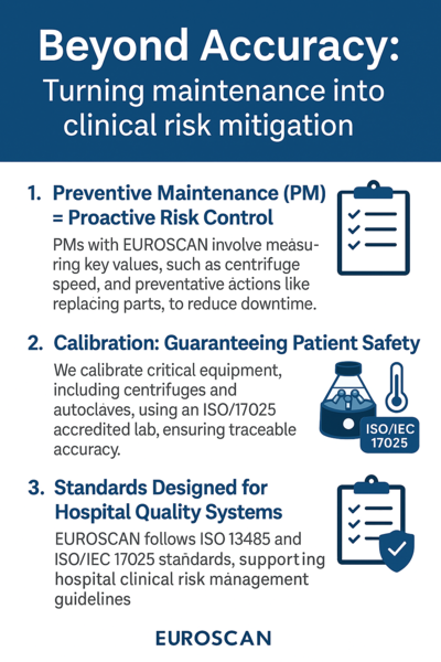 ในระบบคุณภาพของโรงพยาบาลยุคใหม่ “Risk” ต้องถูกจัดการ ก่อน เกิดความผิดพลาด EUROSCAN จึงมองงานบำรุงรักษาและสอบเทียบไม่ใช่เพียงงานซ่อมบำรุง แต่เป็น ระบบป้องกันความเสี่ยงทางคลินิก (Clinical Risk Mitigation) ที่ช่วยให้ห้องปฏิบัติการปลอดภัยและแม่นยำสูงสุด